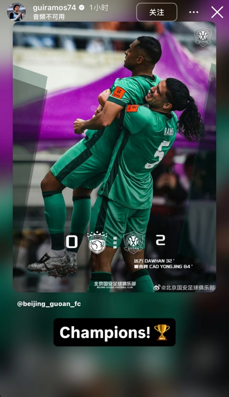 赛后国安新援吉列尔梅·拉莫斯更新社媒,晒出一张以自己拥抱队友庆祝时的照片为背景的海报,并配文写道:“冠军!”