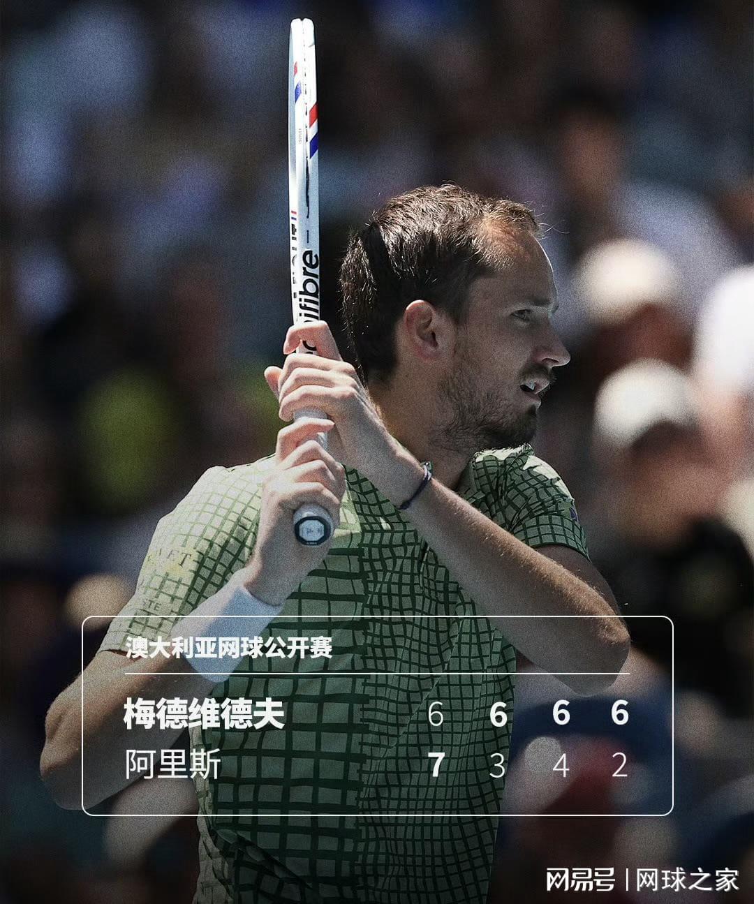 1月21日,三届澳网亚军、俄罗斯名将梅德韦杰夫在2026年澳网男单第二轮,面对法国选手阿里斯的强力挑战,在首盘抢七9-11惜败后没有慌乱,以6-3、6-4、6-2连扳三盘,耗时超过三小时完成逆转,职业生涯第七次闯入澳网32强。