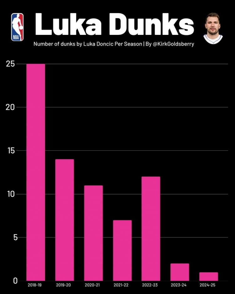 数据统计显示,东契奇新秀赛季曾完成25次扣篮,但之后单赛季扣篮数再未超过15次。